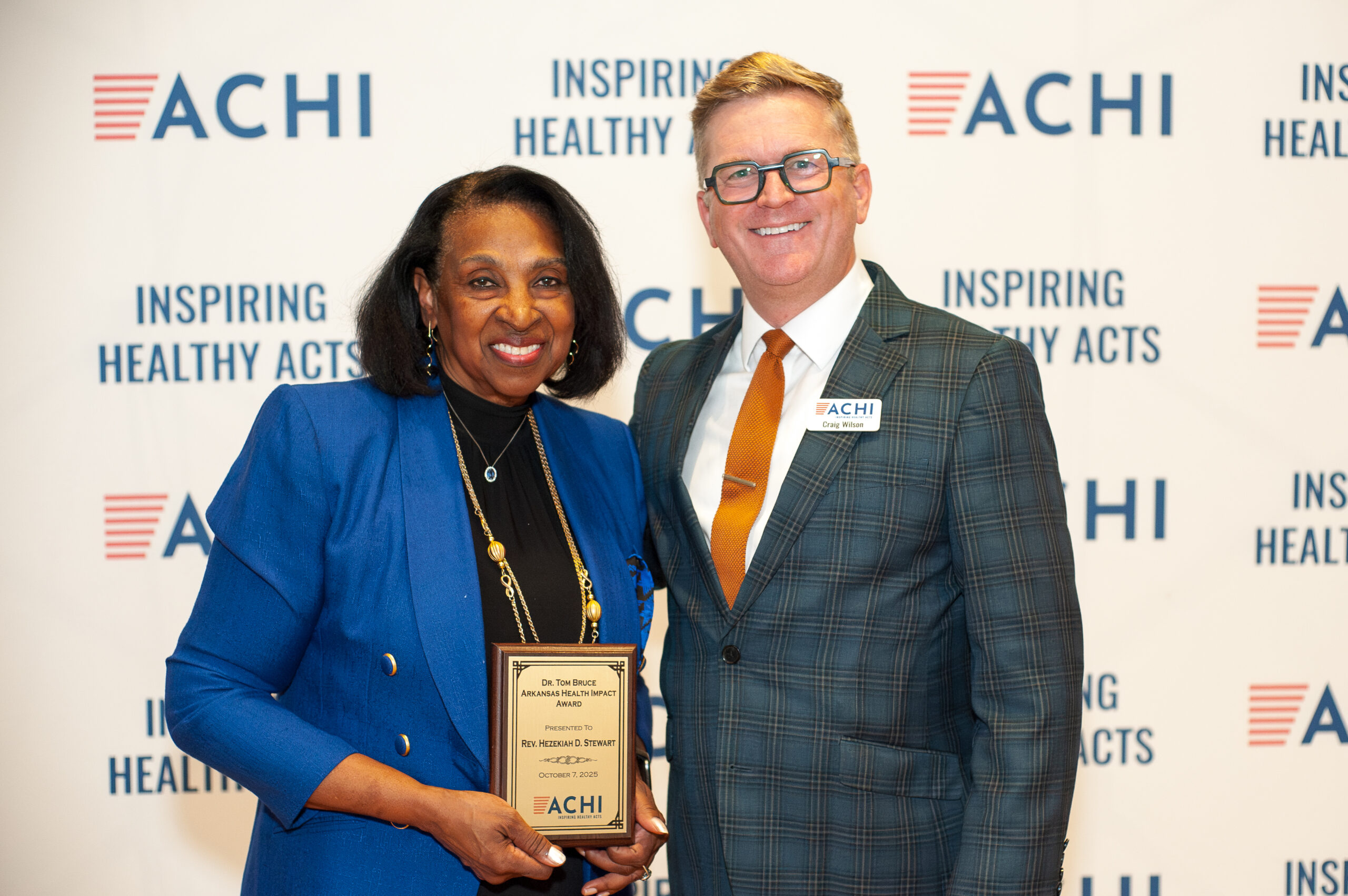 The ACHI Health Policy Board honored the late Rev. Hezekiah D. Stewart on Tuesday with the Dr. Tom Bruce Arkansas Health Impact Award. Stewart’s widow, Diane Stewart, accepted the award during the annual Friends of ACHI Appreciation Event at the Clinton Presidential Center in Little Rock.