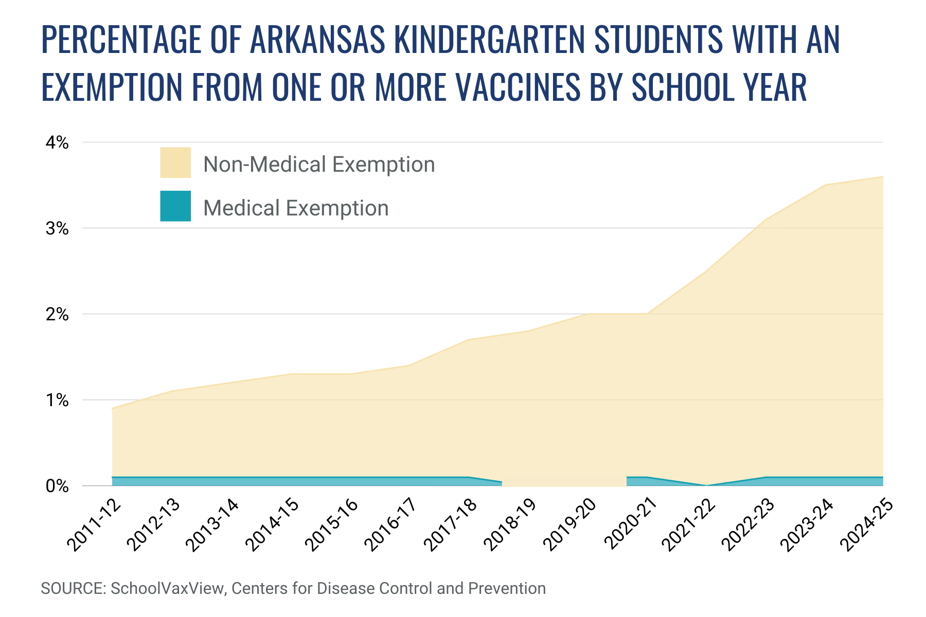 Most states allow children to be exempted from vaccines for medical or non-medical reasons; the latter may be allowed for either religious or philosophical reasons — or, in the case of Arkansas and 13 other states, both. CDC data show that for the 2024-25 school year, 3.5% of Arkansas kindergarten students had non-medical vaccine exemptions and 0.1% had medical exemptions. This was a slight increase from the 2023-24 school year, when 3.4% of Arkansas kindergarten students had non-medical vaccine exemptions and 0.1% had medical exemptions.