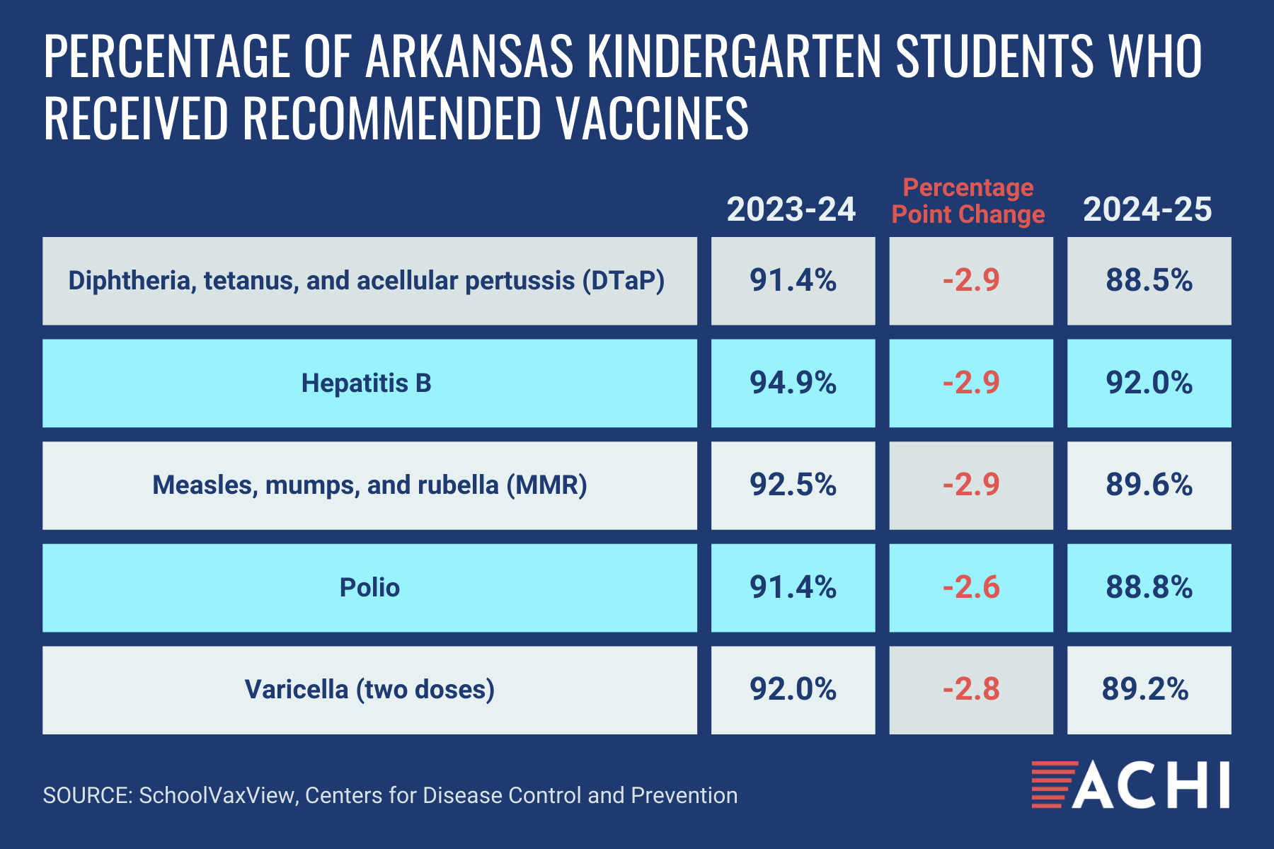 The findings are based on data submitted by states to the CDC. The agency also reported that vaccine coverage among Arkansas kindergarten students decreased in the 2024-25 school year for all reported vaccines. Nationwide, coverage among kindergarten students increased slightly for hepatitis B, going from 93.9% in the 2023-24 school year to 94% in the 2024-25 school year, but decreased for diphtheria, tetanus, and acellular pertussis (dTaP); measles, mumps, and rubella (MMR); polio; and a two-dose regimen of the varicella vaccine.