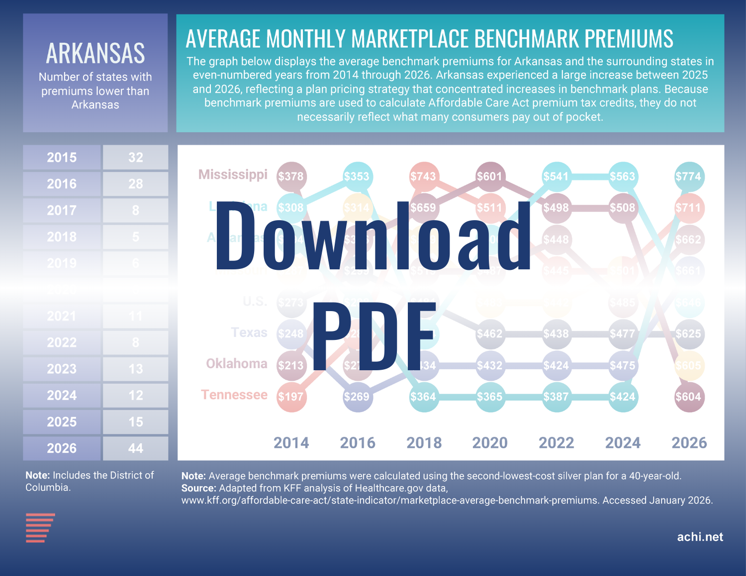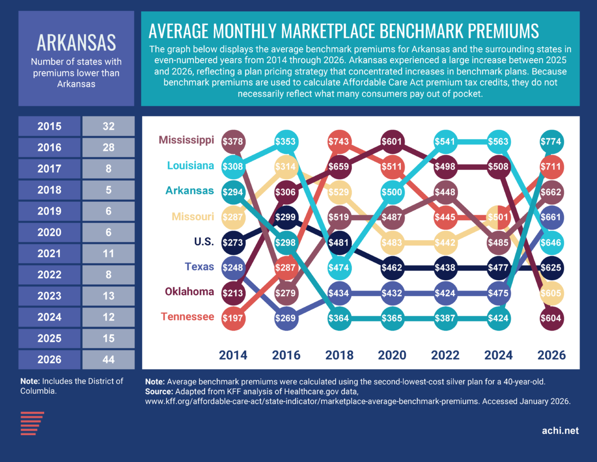 A regional comparison shows that Arkansas’s average monthly benchmark premium was lower than those of the surrounding states during the years 2018 through 2025 but is now higher than the premium of any neighboring state.