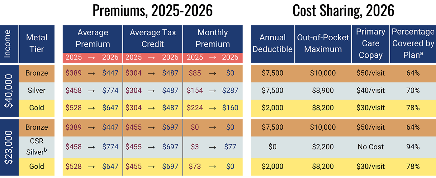 b Silver CSR plans cover 94%, 87%, or 73% of healthcare expenses for individuals with incomes of 138%-150%, 151%-200%, or 201%-250% of the federal poverty level, respectively. An annual income of $23,000 is 144% of the 2026 federal poverty level and so qualifies for a CSR plan that covers 94% of expenses. An annual income of $40,000 is 251% of the 2026 federal poverty level and so does not qualify for a CSR plan.