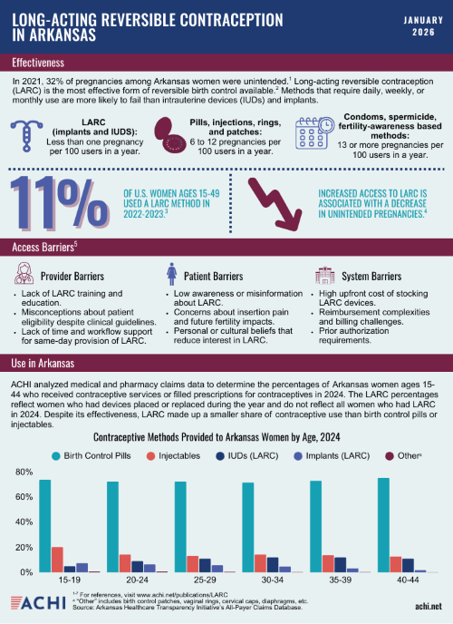 In Arkansas, nearly 1 in 3 pregnancies were unintended in 2021, highlighting the need for access to effective contraceptive methods. Long-acting reversible contraception (LARC) is the most effective form of reversible birth control available, but LARC uptake has historically been low both in Arkansas and nationally. This infographic looks at LARC use in Arkansas, including barriers to access and utilization patterns.