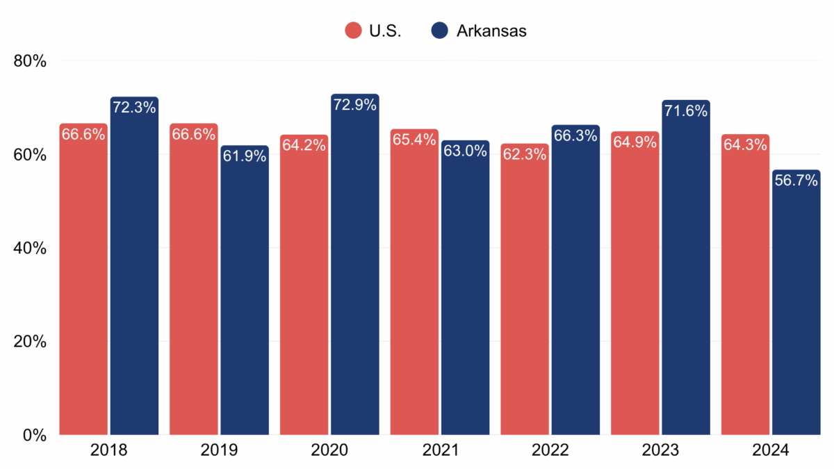 Self-insured health plans are governed by the federal Employee Retirement Income Security Act (ERISA), which is enforced by the U.S. Department of Labor. Employers offering self-insured plans are subject to ERISA’s fiduciary standards — including obligations to guard against waste, abuse, and neglect — but ERISA preempts most state laws from applying to self-insured plans.[3] A TPA performing only administrative services on behalf of a self-insured plan is not directly subject to ERISA’s fiduciary standards, but when a TPA exercises discretionary control over plan management, assets, or benefit determination, courts have found that it may act as a functional fiduciary under ERISA. Because ERISA has occupied the regulatory field, meaning that it preempts state laws, self-insured health plans are exempt from complying with many state-level health insurance regulations, such as network adequacy requirements, premium rate approval requirements, and coverage mandates. In Arkansas, however, TPAs are required to register annually with the Arkansas Insurance Department.[5] The department’s annual report for 2023 states that 403 TPAs were registered, including 20 licensed as resident business entities and 383 licensed as non-resident business entities.[6] Figure 2 shows the share of private-sector employees enrolled in self-insured plans among firms with 50 employees or more in Arkansas compared to the national average.[7]